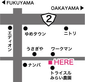 JR倉敷駅より車で約20分 2号線バイパスニトリ倉敷店より車で約7分 水島インターチェンジより車で約10分 JR茶屋町駅より車で約20分
